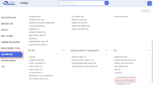 홈택스에서 확인하기 국세청 전화문의 홈택스에서 확인하기로 들어가시면 아래와 같이 전체메뉴 화면이 홈택스 전체메뉴 화면이 나옵니다. 좌측 메뉴에서 '상담 불복 제보' 누르시고, 기타 메뉴에서 '사업자상태 조회(주민등록번호)'를 누르시면 쉽게 홈텍스에서 주민등록번호로 사업자등록번호 확인하실 수 있습니다.